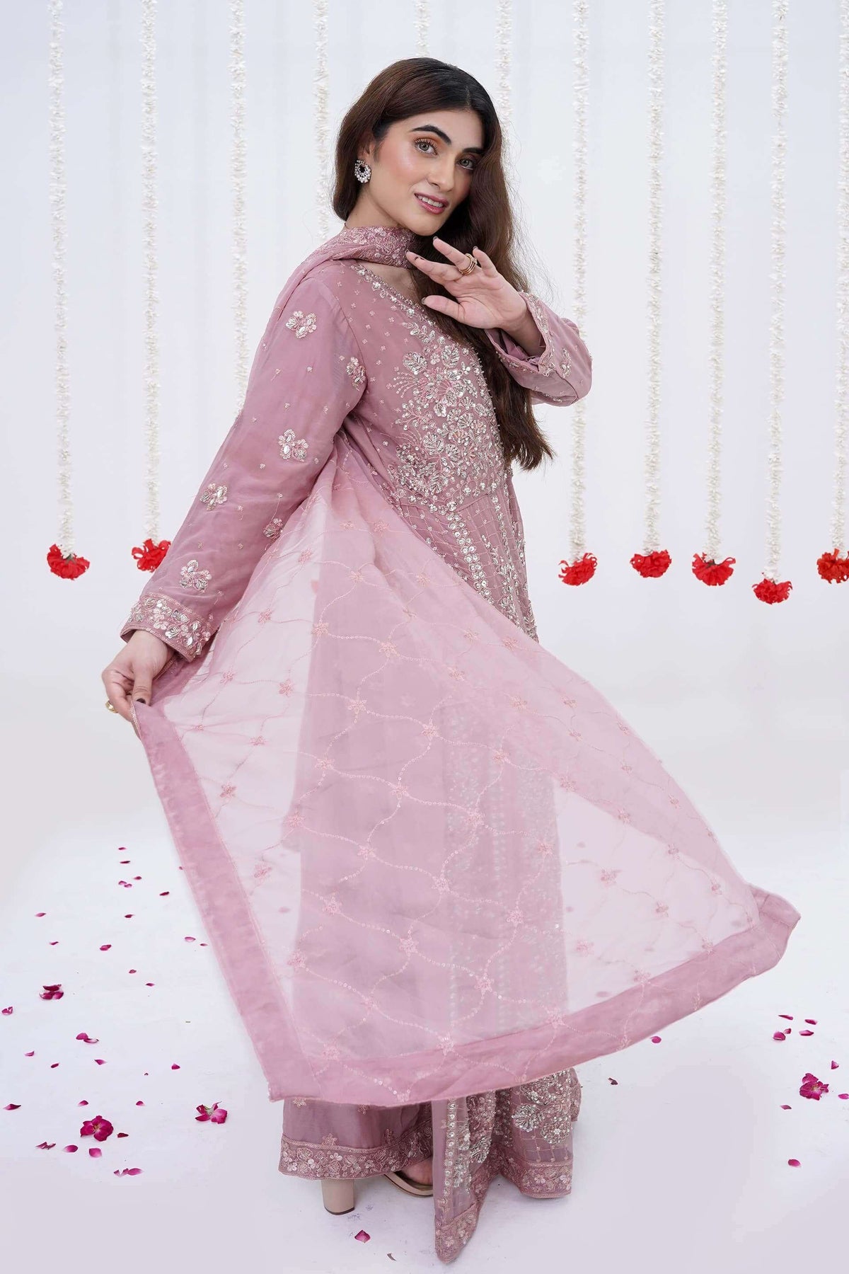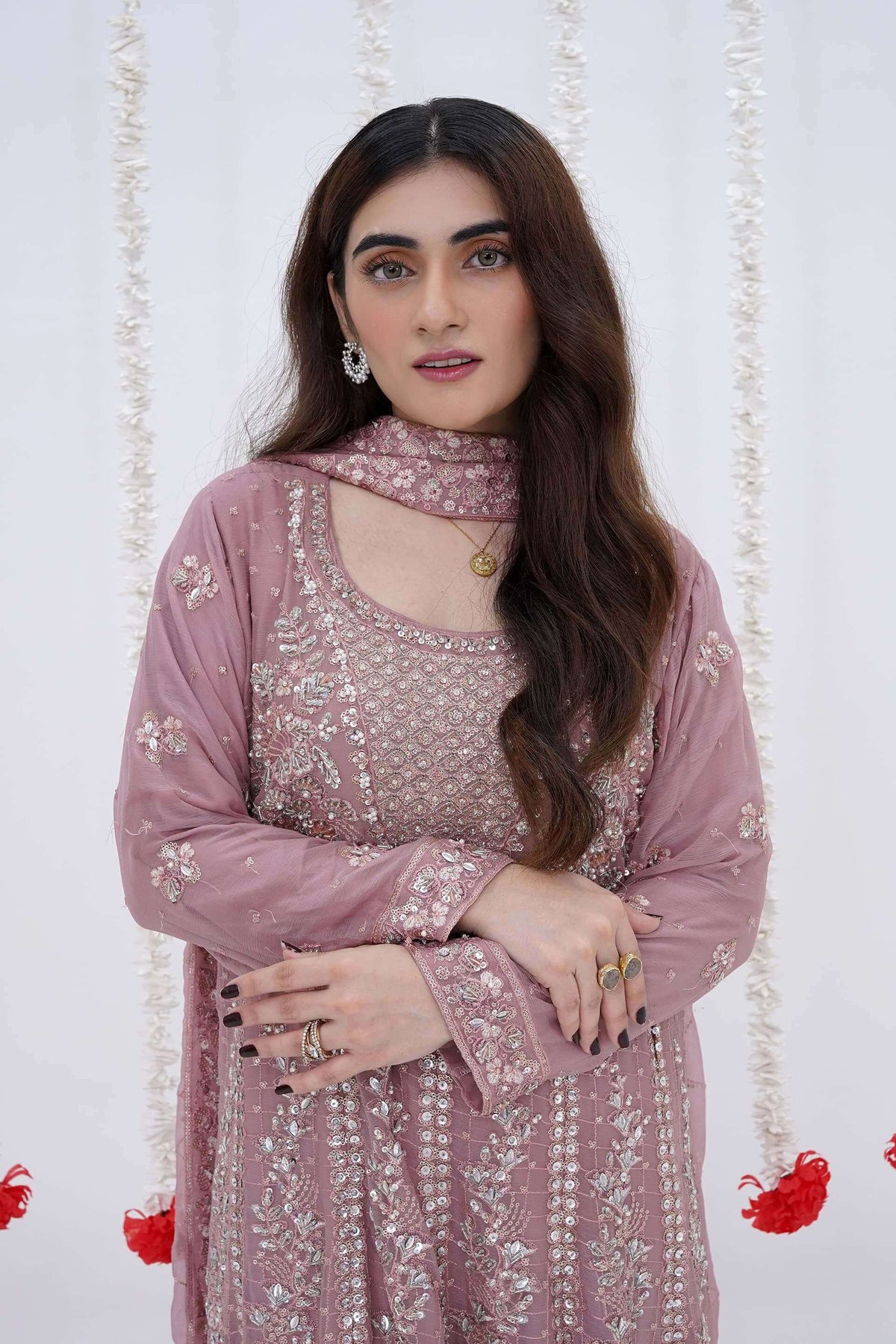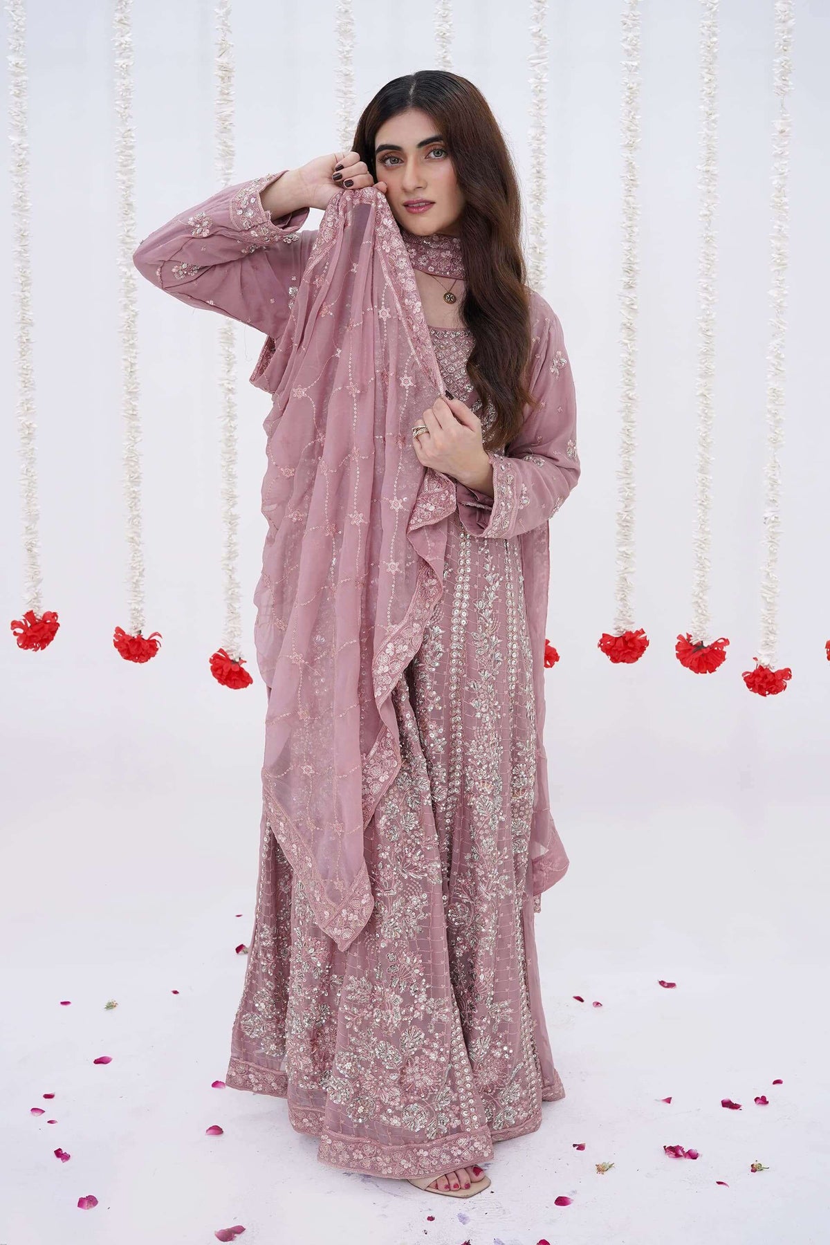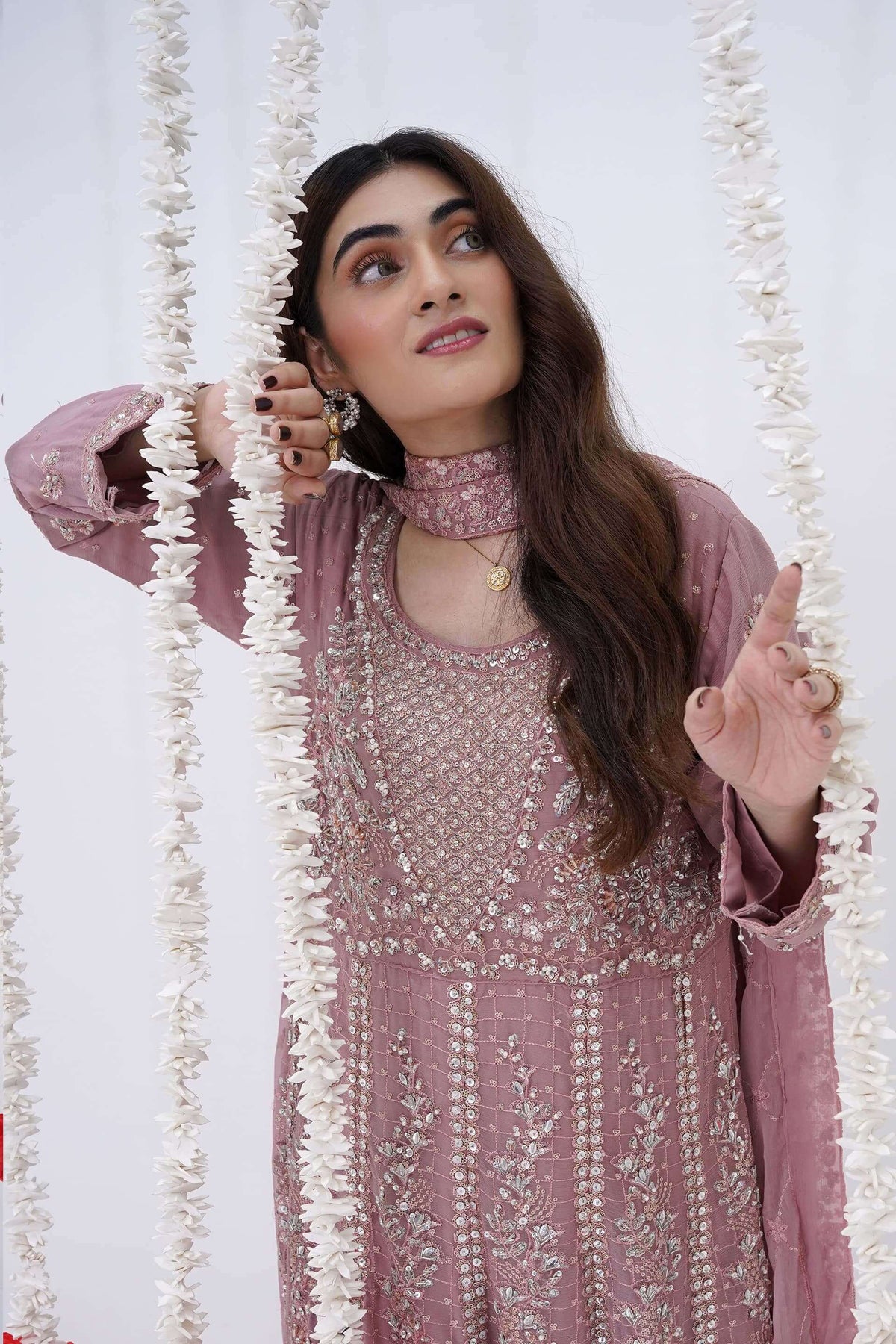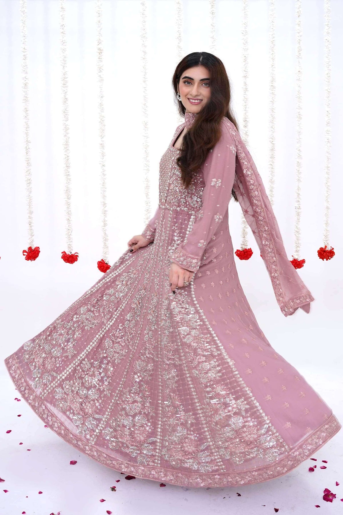 A sophisticated mauve chiffon maxi dress, designed with fine handwork for weddings, parties, and formal occasions. This elegant gown is part of our luxury dresses line, blending designer clothing for women with comfort and timeless beauty. A chic piece for women’s designer wear collections. Matching dupatta included.