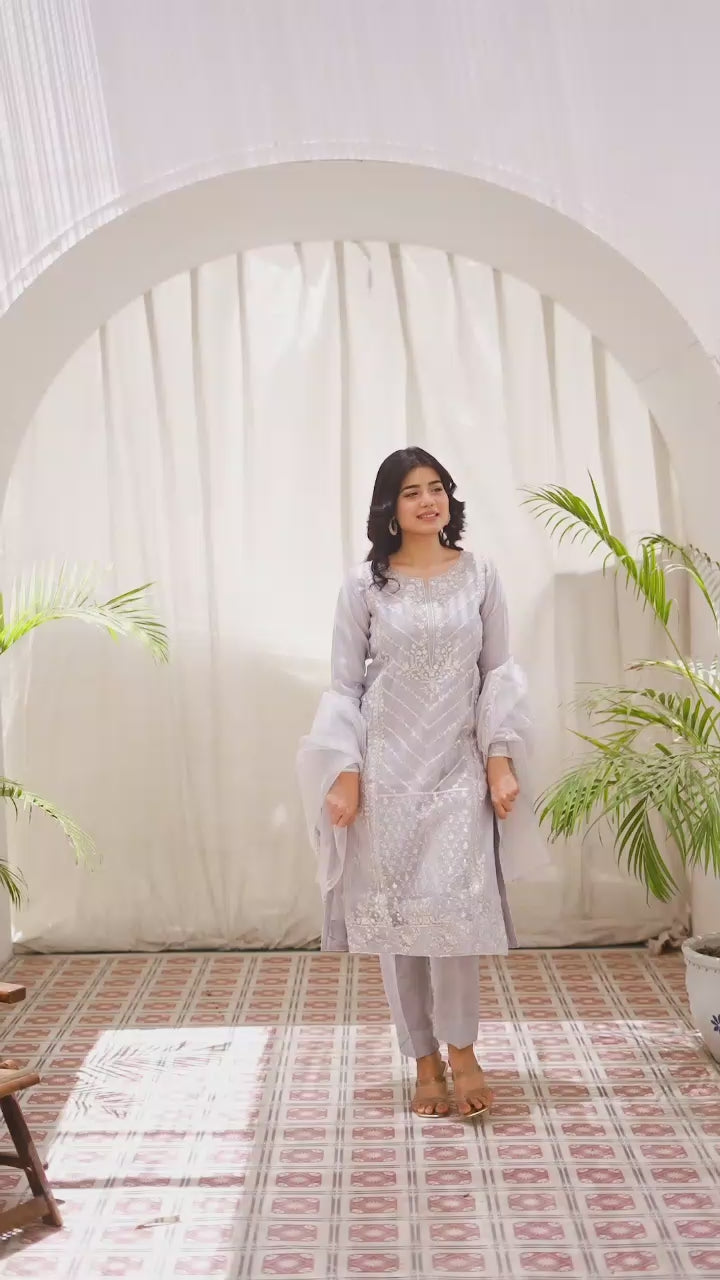 Embrace sophistication with our Women’s Lilac Organza Shalwar Kameez, featuring delicate white embroidery. This three-piece suit, with a lightweight kameez, shalwar, and dupatta, is ideal for weddings, Eid, or festive events. Available in S-M-L. Free shipping!